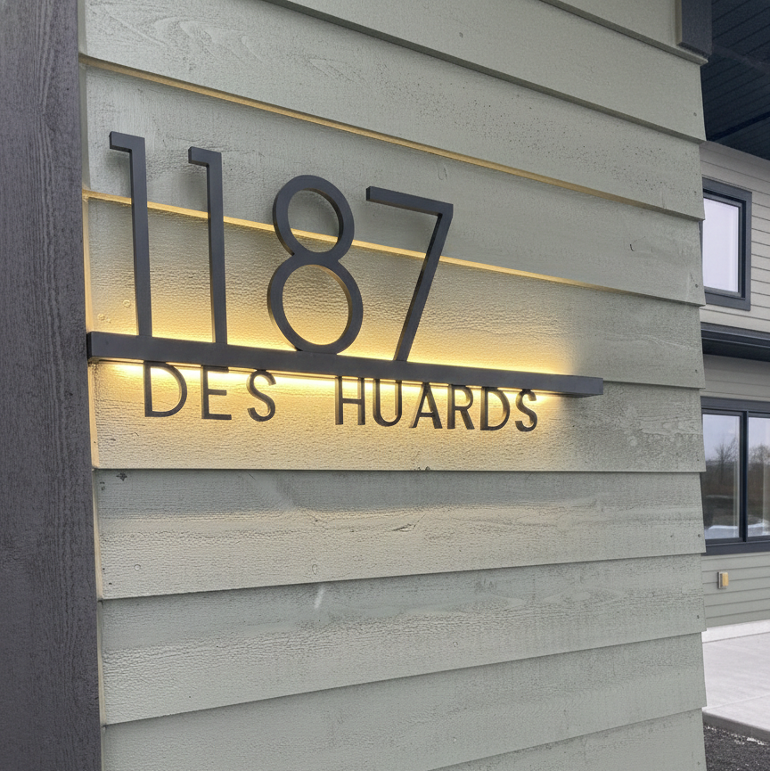 Tous nos produits sont pensés pour être simples et rapides à installer, peu importe le modèle que vous choisissez. Nous incluons des gabarits de positionnement qui vous aident à aligner parfaitement votre adresse ou votre plaque. De plus, une trousse d’installation complète est fournie pour faciliter le processus.